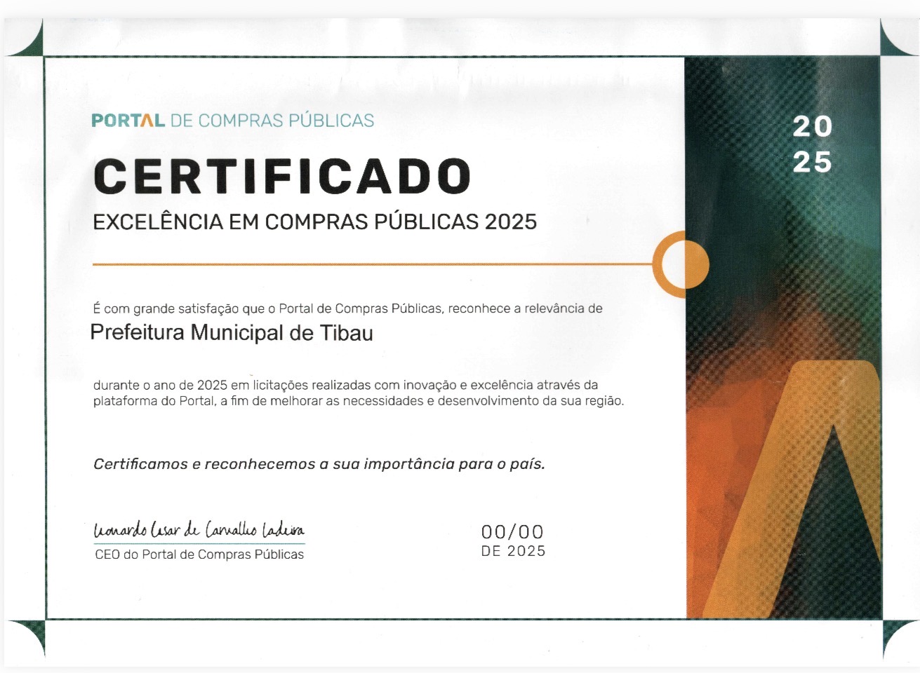 A Prefeitura de Tibau recebeu, no dia 26 de março, o certificado de "Excelência em Compras Públicas" pelo segundo ano consecutivo. O reconhecimento foi concedido ao Setor de Compras e Licitação do município.